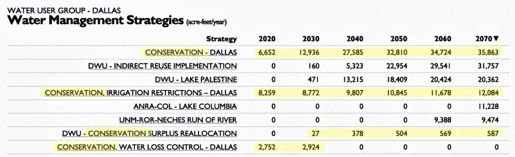 After considering our non-renewable and finite water supply versus water demand increasing with population over time in Dallas we know that to preserve enough water for the future through governmental means has a cost that public citizens must pay. Here is a snapshot from Texas Water Development Board’s texasstatewaterplan.org showing the water management strategies and the volume of water they are projected to conserve in Dallas, Texas between 2020 and 2070 presented by decade.