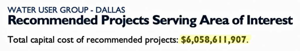 Below the water management strategies is the recommended projects serving Dallas, Texas total capital cost calculated by TWDB found on the texasstatewaterplan.org website. You can see that the costs of preventing water shortage through 2070 in Dallas total over $6 Billion that will be funded by taxpayers. The acre-feet totals per decade are 17,663 in 2020, 25,290 in 2030, 56,308 in 2040, 85,522 in 2050, 106,324 in 2060, and 121,355 in 2070.